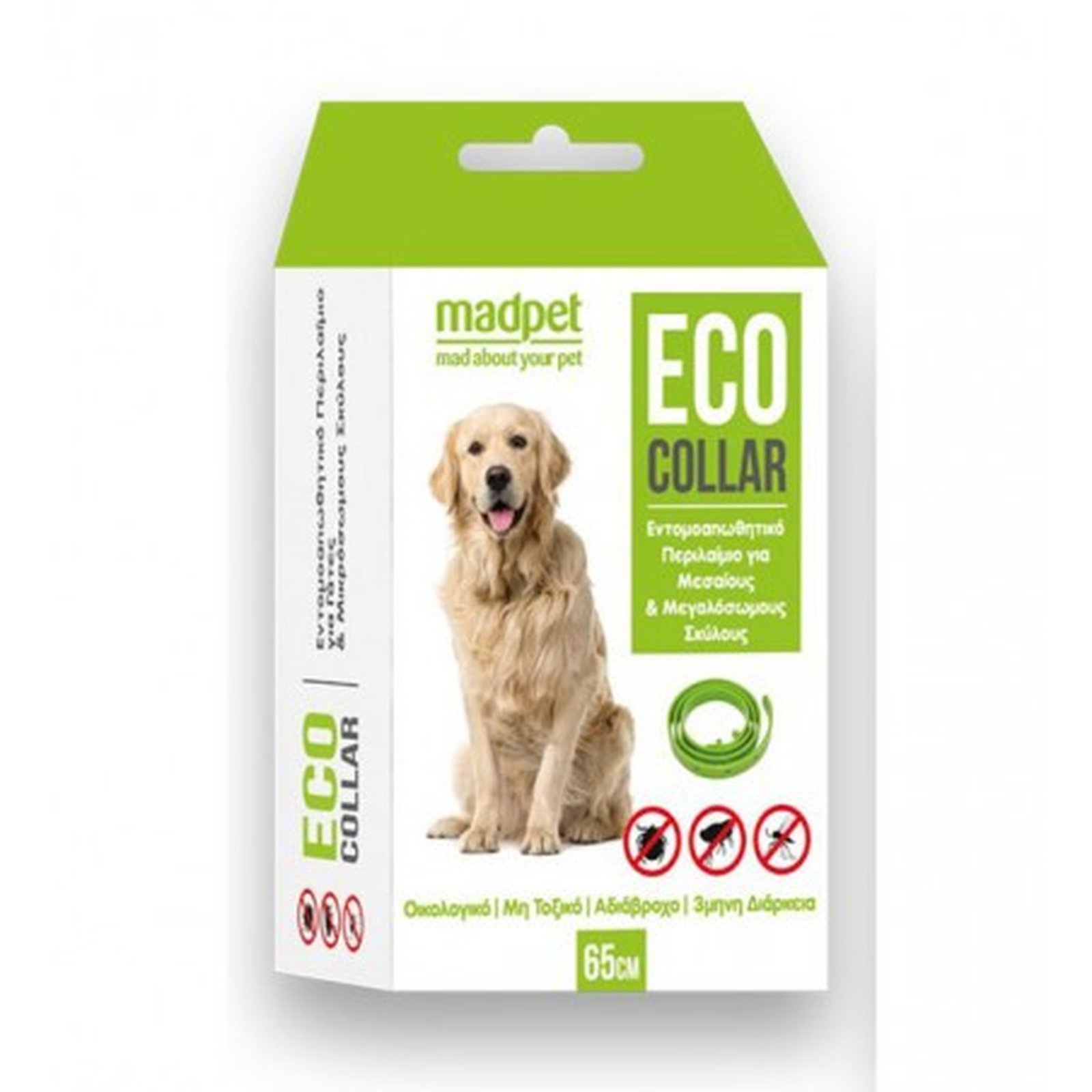 ΑΝΤΙΠΑΡΑΣΙΤΙΚΟ ΟΙΚΟΛΟΓΙΚΟ ΚΟΛΑΡΟ ΣΚΥΛΟΥ ECO COLLAR 65cm. Το MadPet Eco collar είναι ένα οικολογικό εντομοαπωθητικό περιλαίμιο (ψύλλοι, τσιμπούρια, σκνίπες & κουνούπια), ατοξικό και φιλικό προς το περιβάλλον. Περιέχει μία ειδική σύνθεση ενεργών συστατικών που διαμοιράζονται στο σώμα του ζώου παρέχοντας ένα ευχάριστο άρωμα και καθιστώντας λαμπερό το τρίχωμα, χωρίς να είναι ευπαθές στην παρουσία νερού.
